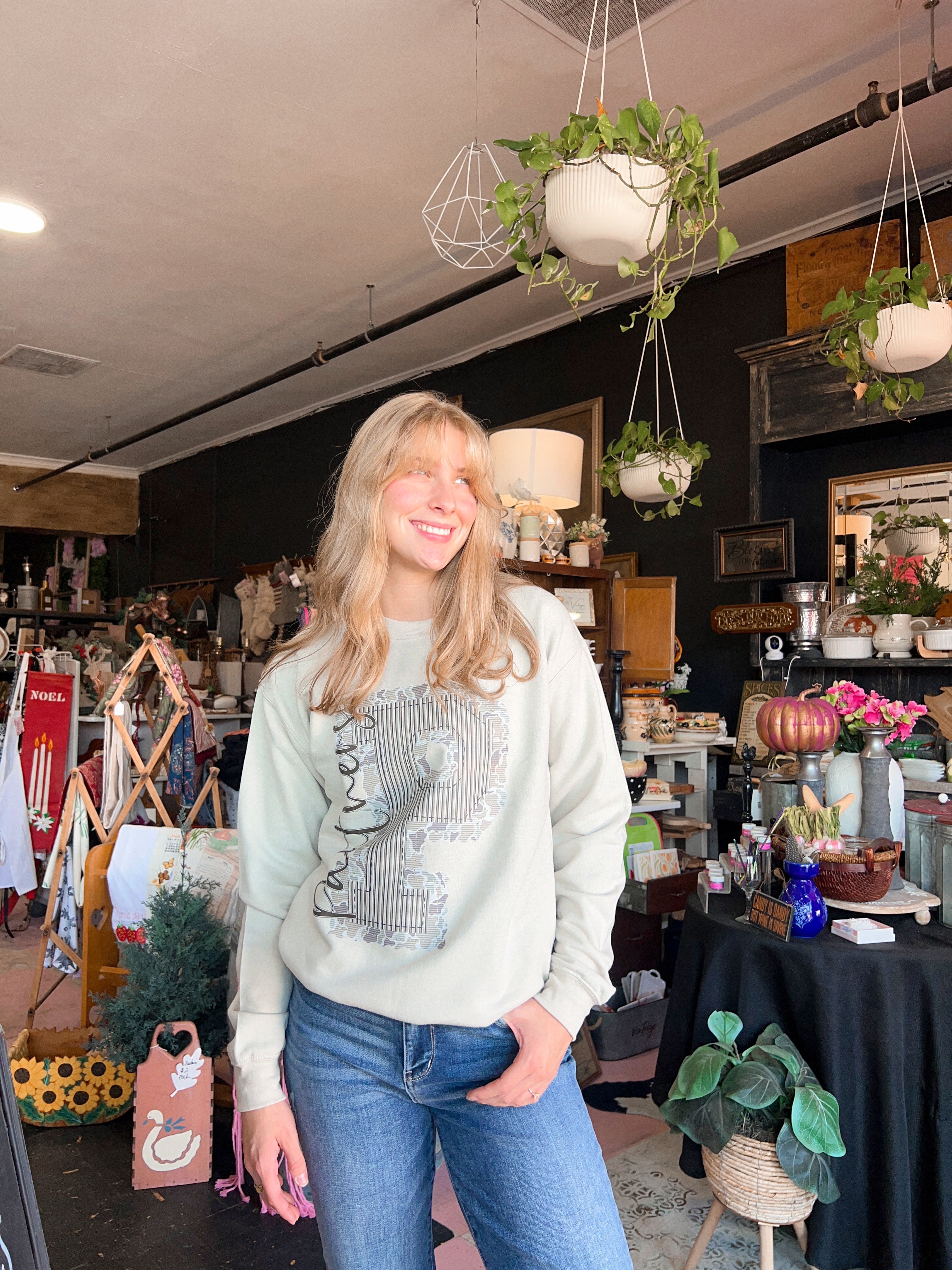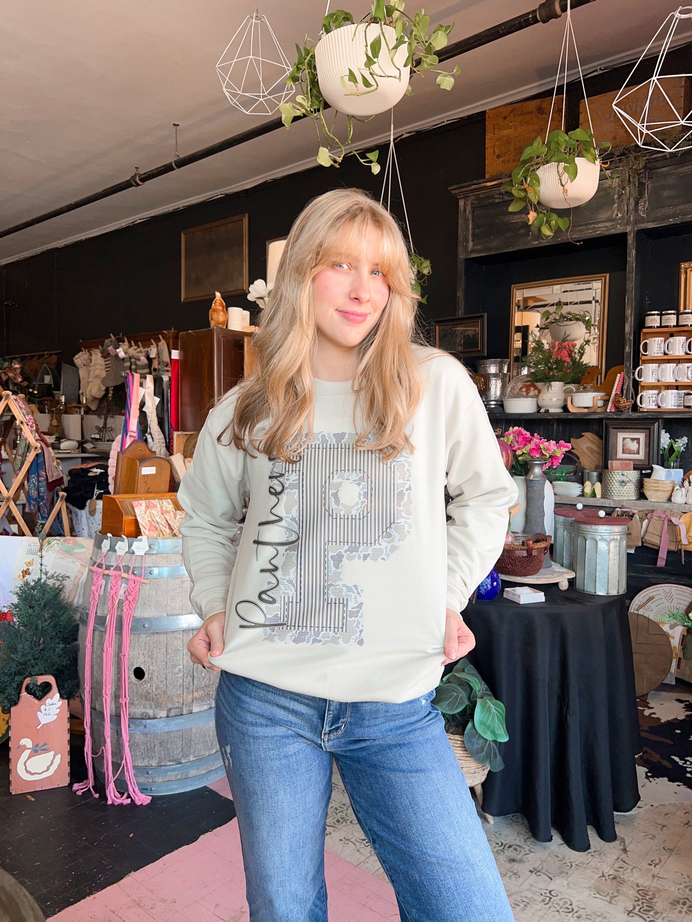 Prepster meets camo in the cutest way! This design features a bold, collegiate-style letter with a fierce camo base and mascot layered across for that perfect touch of sass. Whether you're cheering from the bleachers or running errands, this sweatshirt brings the fun and school pride!